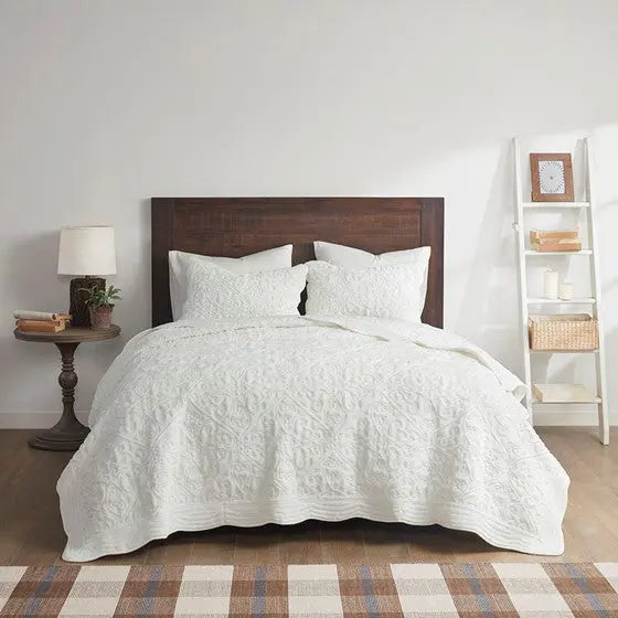 Give your bedroom a cozy cabin update with the Madison Park Aster 3 Piece Embroidered Faux Fur Coverlet Set. This coverlet and 2 matching shams feature embroidered ivory faux fur with a scalloped edge detailing, for a charming lodge look. The coverlet is also filled with polyfiber filling to provide exceptional warmth and comfort. Flaunting a simple design with an elegant flair, this faux fur coverlet coordinates easily with existing bedding or is perfect to use by itself.