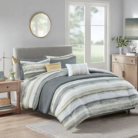 Create a relaxing and tranquil atmosphere in your bedroom with Madison ParkÕs Marina 8 Piece Printed Seersucker Comforter and Coverlet Set Collection. The textured seersucker comforter features a watercolor stripe print in yellow and gray hues and a off white reverse, for a serene look. The included coverlet features channel stitch quilting pattern and its gray color complements the bedding set. Two shams mirror the design on the face of the comforter, while the other two quilted shams pair perfectly with the coverlet. Also included are two decorative pillows with embroidered and pleated details that provide the perfect finishing touches to this comforter and quilt set. Use the coverlet quilt alone for the summer season or layer it on the comforter for extra warmth. Hypoallergenic polyester filling in the comforter, coverlet quilt, and decorative pillows provide exceptional warmth and comfort. Machine washable for easy care, this seersucker comforter and coverlet set collection provides a complete transformation for your bedroom decor.
