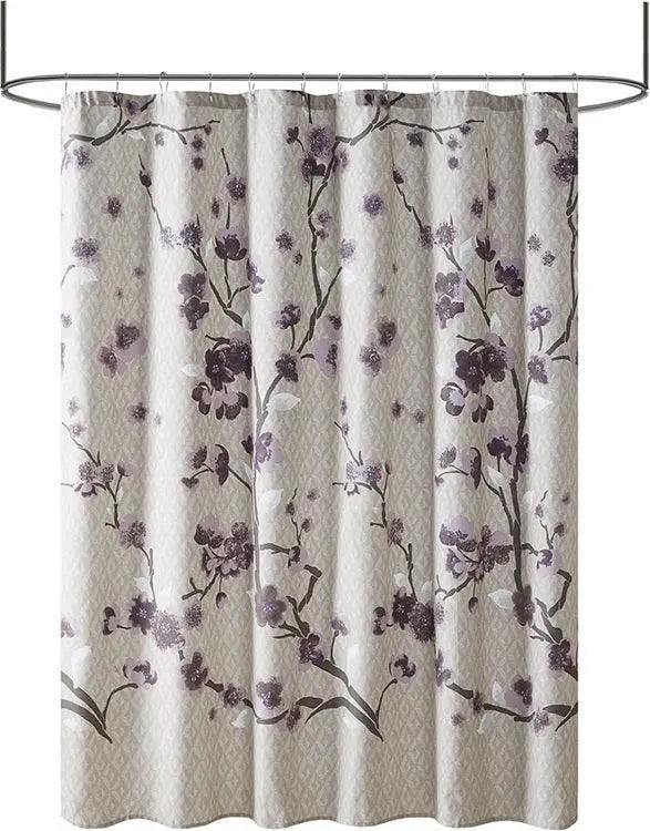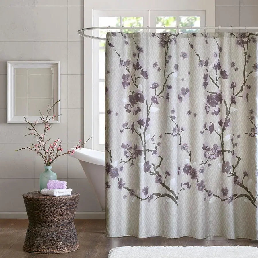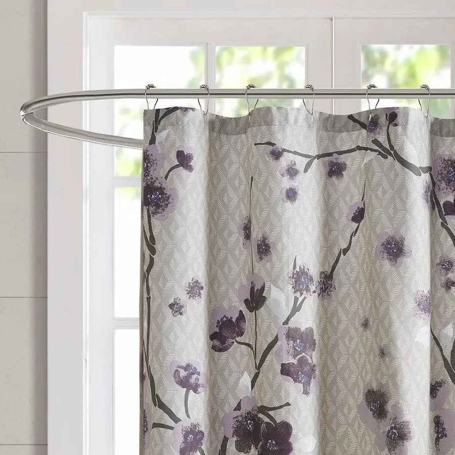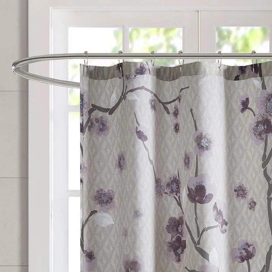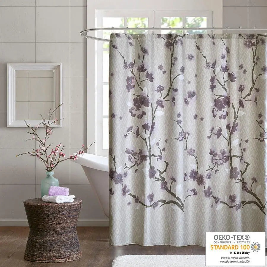 Put a modern touch on your decor with the Madison Park Holly Collection. This 100% cotton shower curtain features an allover cherry blossom design with branches. The soft grey background pairs beautifully with the purple and grey flowers for the perfect update to your space. Machine washable for easy care, this shower curtain is also OEKO-TEX certified meaning it does not contain any harmful substances or chemicals for the best in quality comfort and wellness. Each shower curtain measure 72"x72" and is finished with 12 button holes at the top making it easy to hang; hooks, rod, and a water repellant liner are not included and will need to be purchased separately. Complete the look with coordinating bedding, available and sold separately.