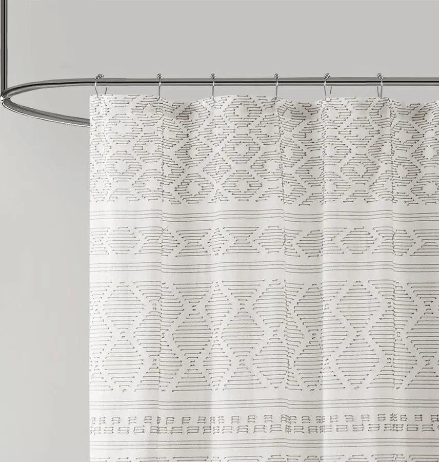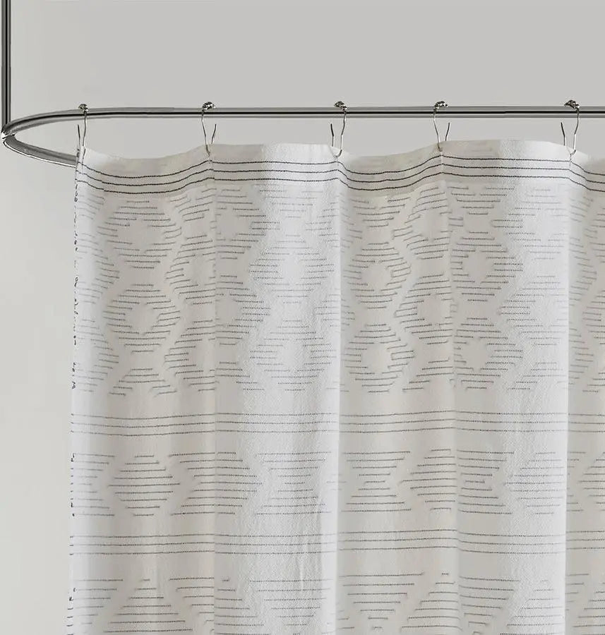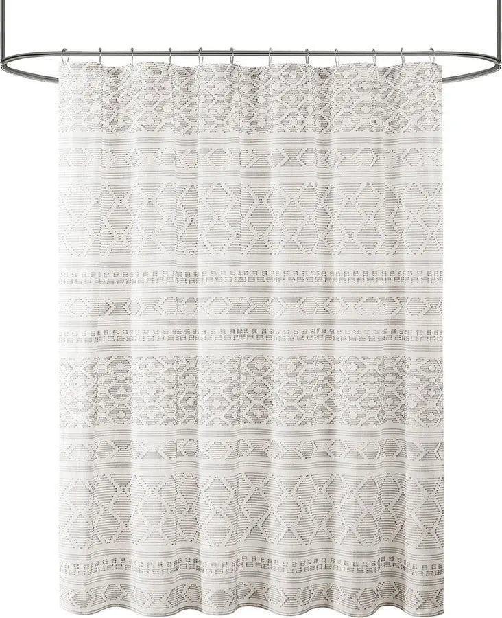 Update your bathroom with our Urban Habitat Lizbeth Cotton Clip Jacquard Shower Curtain. This shower curtain features clipped jacquard geometric patterns, in soft white and grey colors on a crisp 100% cotton fabric, for a natural and casual modern look. Machine washable for easy care, this shower curtain is also OEKO-TEX certified meaning it does not contain any harmful substances or chemicals to ensure quality comfort and wellness. Each shower curtain measure 72Óx72Ó and is finished with 12 button holes at the top making it easy to hang; hooks, rod, and a water repellant liner are not included and will need to be purchased separately. Complete the look with coordinating bedding, available and sold separately.