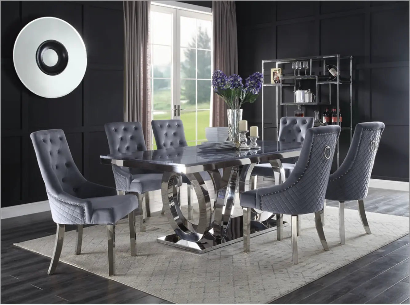 Nasir Gray Printed Faux Marble & Mirrored Silver Finish Dining Room Set