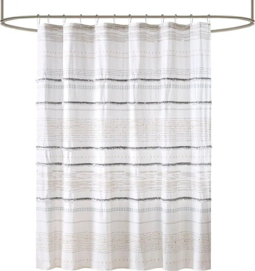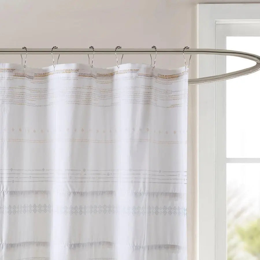 The INK+IVY Nea Cotton Printed Shower Curtain with Trims offers a stunning contemporary update to your bathroom. This 100% cotton shower curtain features tassels and a printed stripe pattern creating a chic boho look. Finished with 12 button holes at the top, this shower curtain is machine washable for easy care. Coordinating bedding set is available and sold separately.