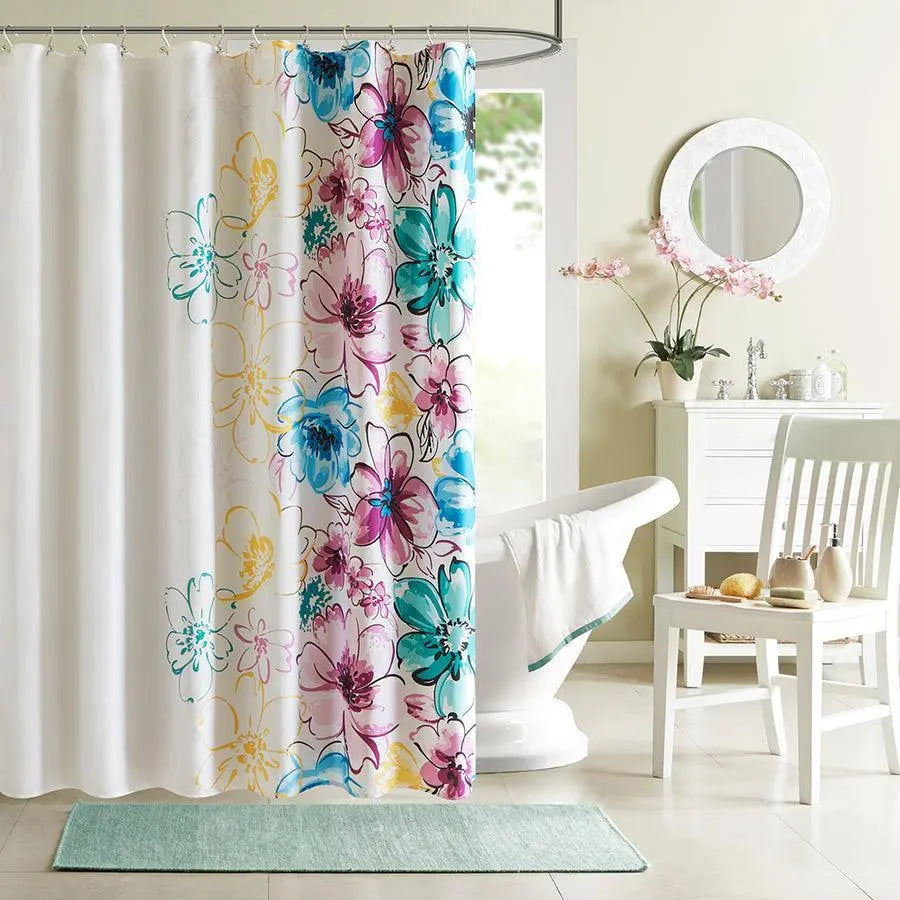 The Intelligent Design Olivia Shower Curtain uses bright colors and an asymmetrical floral design to dazzle your space. Pops of teal, green, fuschia and yellow adorn one side of the curtain while the white base is featured on the opposite side.