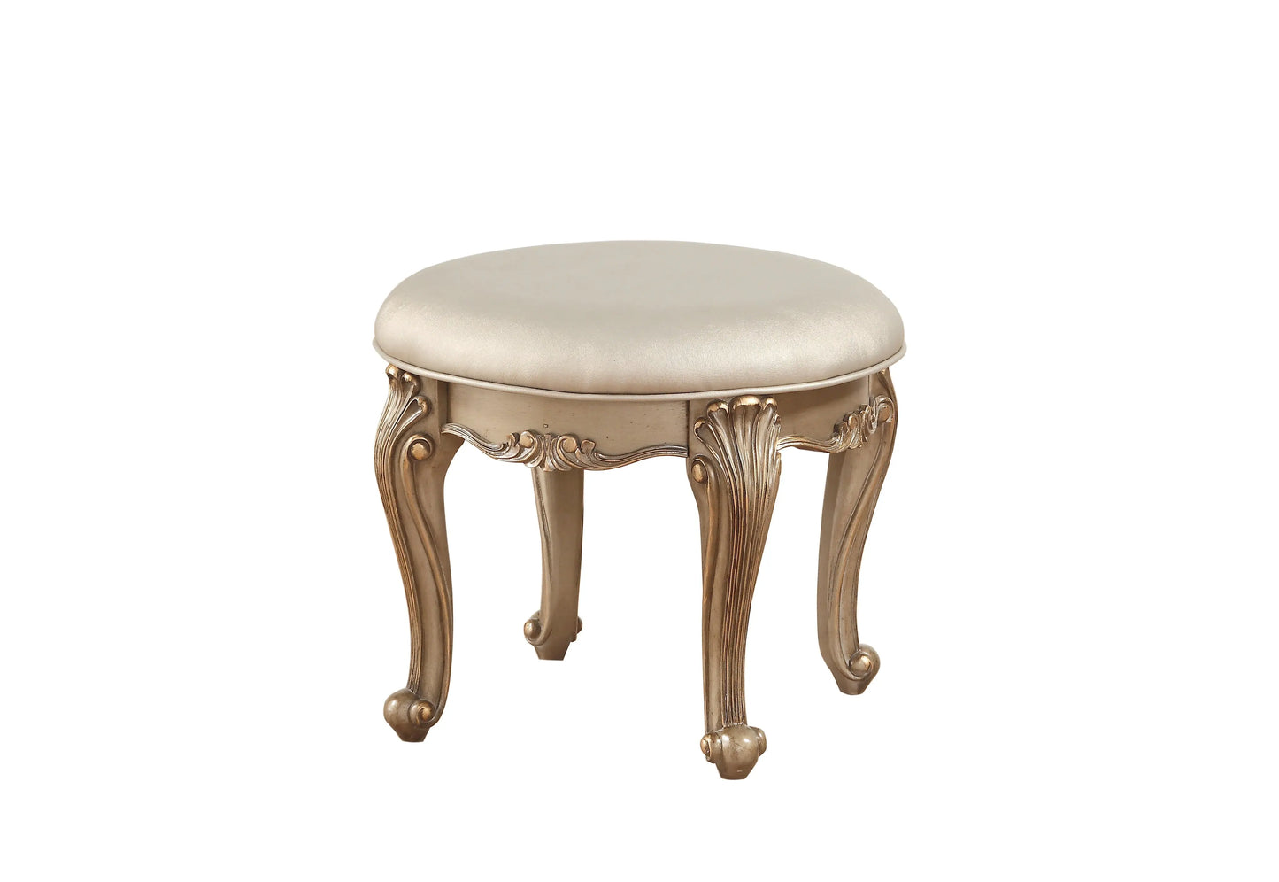 The Orianne vanity stool is exclusively designed and filled with romantic spirit. A piece crafted and inspired by the luxurious designs of the past, this gorgeous antique gold finish vanity stool features a champagne padded seat. With a frame featuring floral accents and Queen Anne style legs, this uniquely designed stool will make a statement in any bedroom.