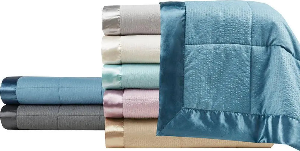 Make every night a cozy one with this textured oversized down alternative blanket. The color-matched 3" satin trim adds a luxury element that feels great on your skin. It features a 3M Scotchgard Moisture Management Treatment that wicks away moisture while helping release stains. Machine washable for easy care with a classic box quilting design. This hypoallergenic blanket is also OEKO-TEX certified, meaning it does not contain any harmful substances or chemicals, ensuring quality comfort and wellness.
