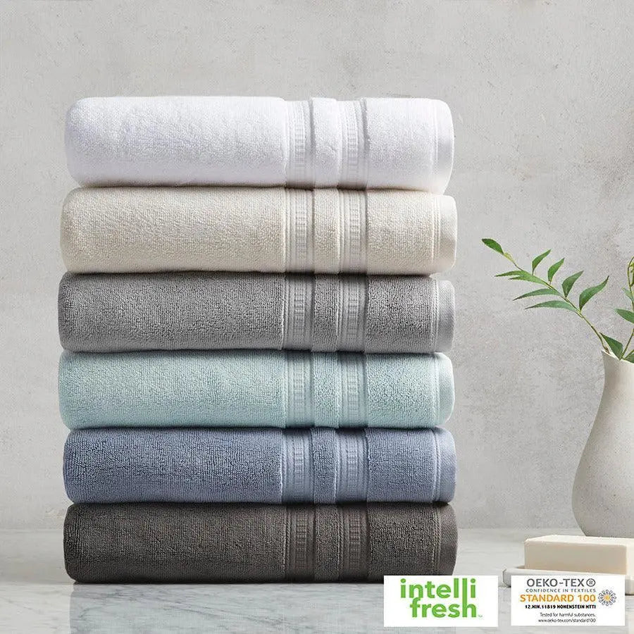Our Beautyrest Plume 100% Cotton Feather Touch Towel 6 Piece Set offers a perfectly luxurious soft addition to your bathroom. Each towel is made from 750gsm premium quality cotton for a cashmere like hand feel that is also absorbent and durable; as the PVA free 3PLY zero twist like construction provides a long-lasting softness while also making this towel set economical and eco-friendly. These towels are also OEKO-TEX certified, meaning it does not contain any harmful substances or chemicals to ensure quality comfort and wellness. Each towel is treated with intellifresh, powered by silvadur antimicrobial technology, which inhibits odor causing bacteria for enhanced odor control, protects fibers and fabrics, and provides built-in freshness, keeping linen newer, longer. Active for multiple washes, this treatment delivers long-lasting durable odor protection performance, while safeguarding our resources for the best in wellness and well-being.